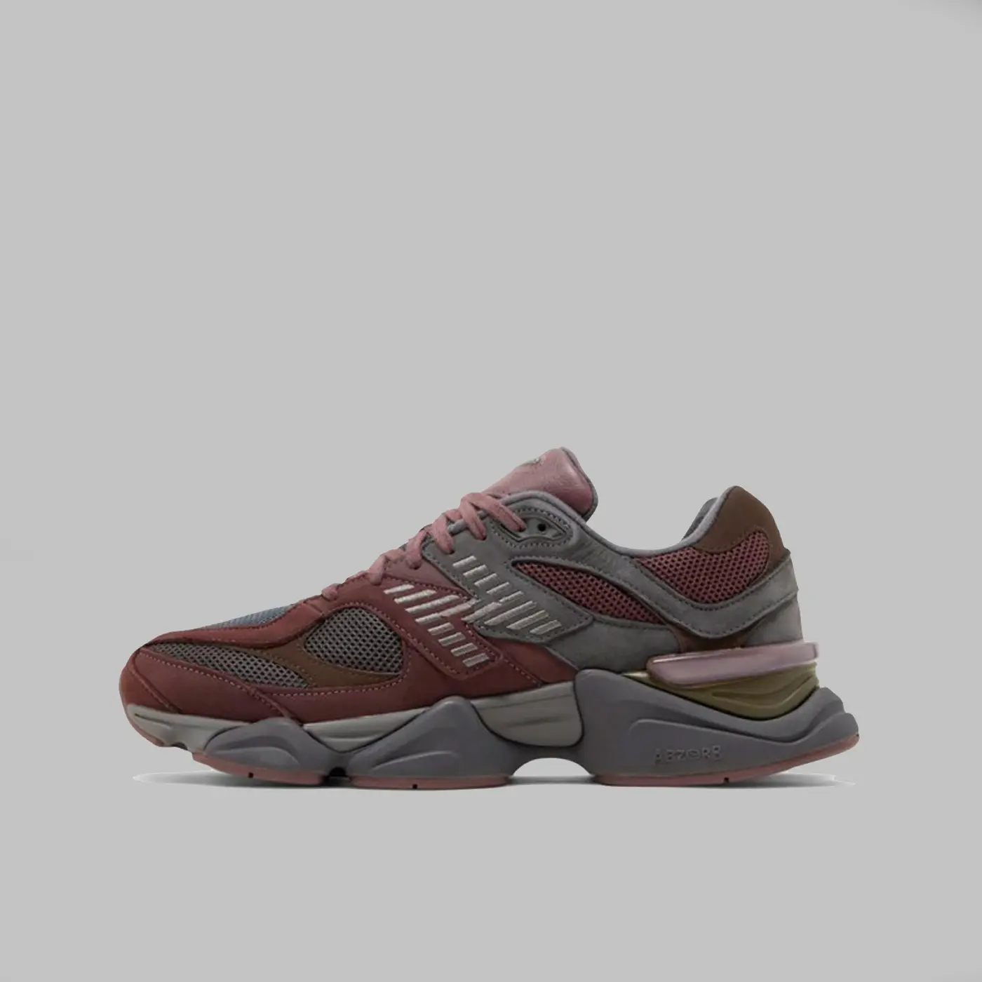 Condusă estetic de tonurile neutre ale toamnei, călcâiul folosește suprapuneri din piele întoarsă în tandem cu nuanțele gri închis ale bazei de plasă din partea din față a piciorului, creând o potrivire de culoare gri metalic pe logo-ul „N” și jumătatea din față a tălpii intermediare. O nuanță vișinie a fost aleasă pentru majoritatea sneakerșilor. Șireturile și limba, care prezintă bijuteria originală a șireturilor 991, sunt puțin deschise la culoare, în timp ce marginea călcâiului și panoul de conectare din partea din față a piciorului sunt finisate într-o nuanță rar de maro ciocolatiu.