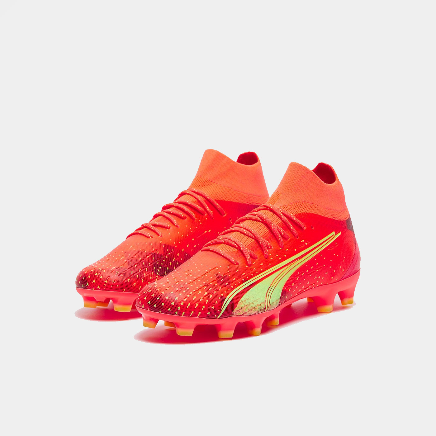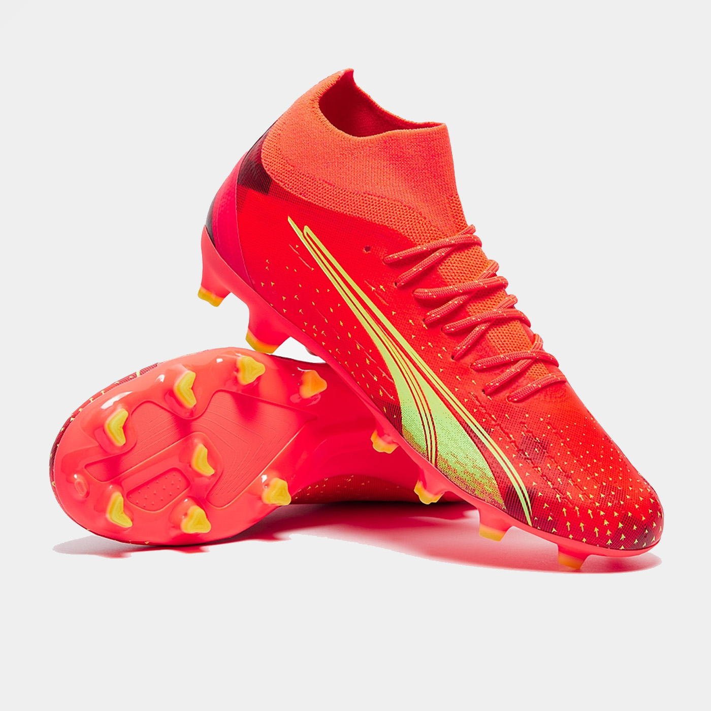 Joacă mai repede ca niciodată purtând ghetele de fotbal PUMA Ultra Pro FG/AG în culorile Fiery Coral/Fizzy Light/Puma Black.