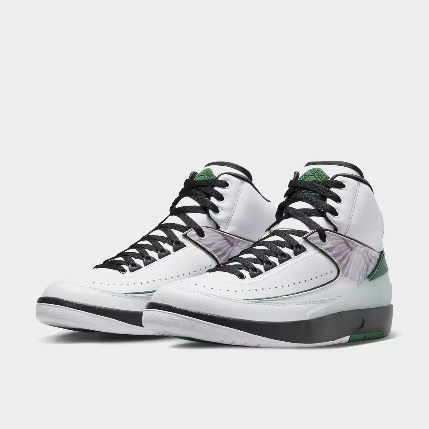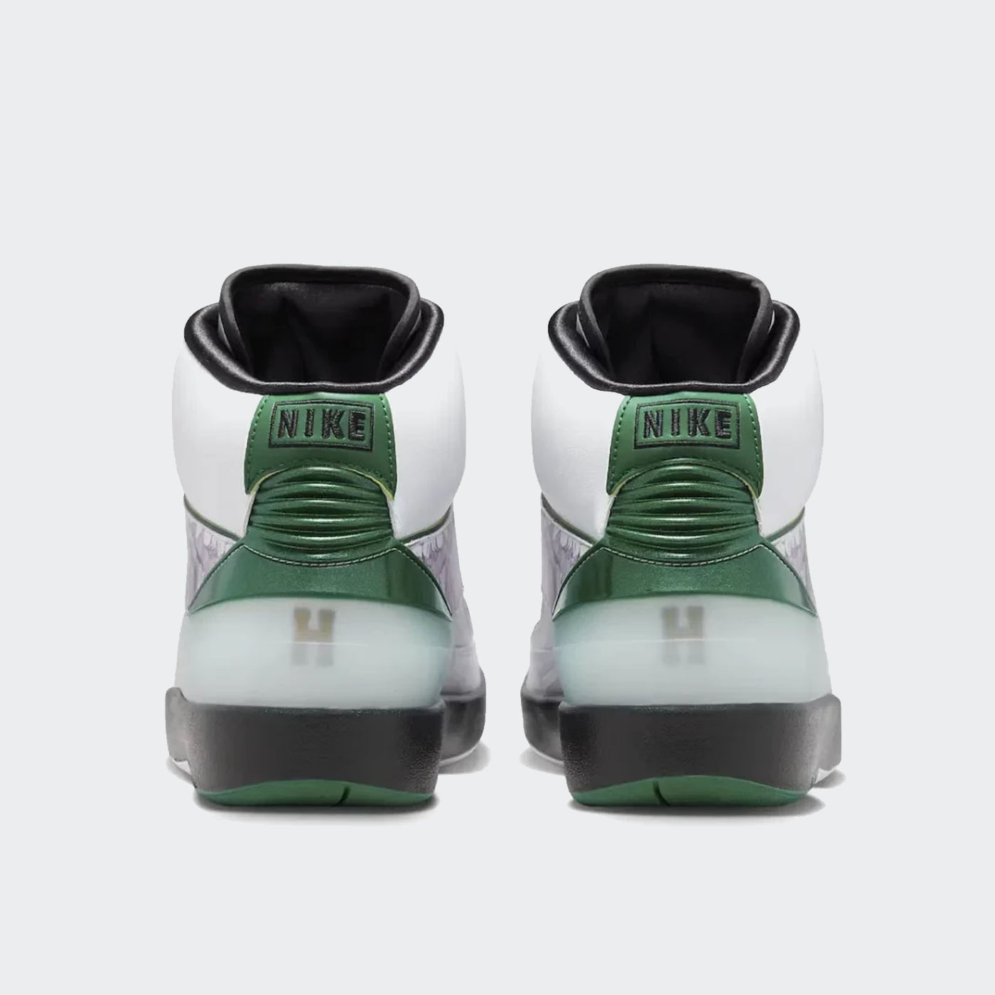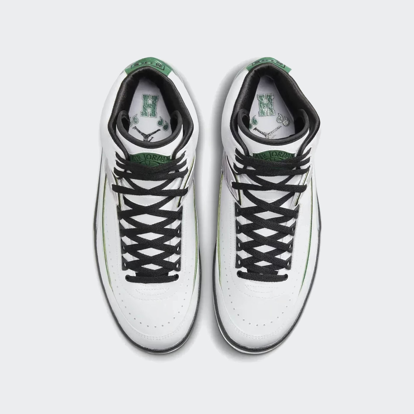 Piesa translucidă pentru călcâi prezintă un stil „H” din folie aurie, care amintește de tricoul lui White de la Universitatea din Maryland, care conținea litera singură. Hituri de verde apar acolo unde s-ar găsi de obicei roșu, în timp ce panoul lateral este făcut să semene cu o pereche literală de aripi, cu penele schițate manual imprimate într-un mod fotorealist. Găzduită în ambalajul original Air Jordan 2 scos direct de la sfârșitul anilor 80, oferta din piele premium și satin arată o amprentă de închidere de „Putere” și „Belief” pe fiecare vârf de dantelă.