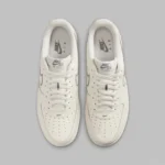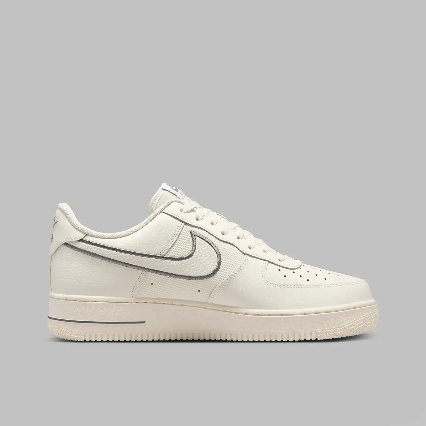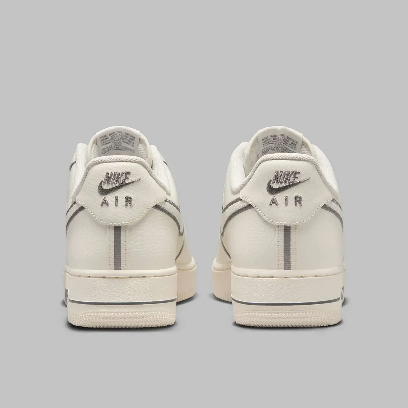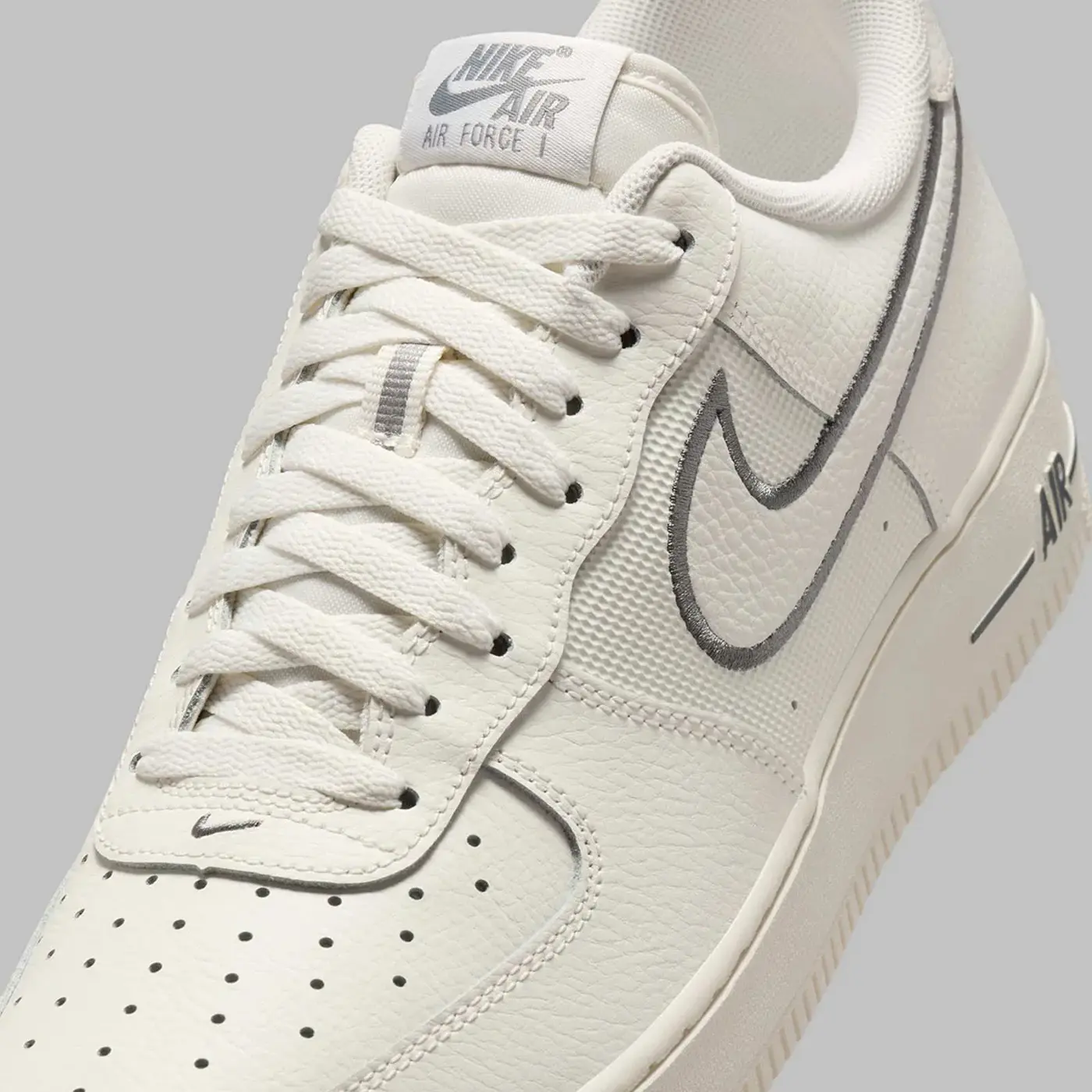 După două compoziții identice, stilul cell-shaded apare acum în nuanțe mai relaxate. Pentru a explica pe scurt schimbările de aici, straturile inferioare 3M se desfășoară sub Swoosh înainte de a bisecta călcâiul, adăugând o notă reflectorizantă designului atemporal al lui Bruce Kilgore. Vopsirea pantofului în alb-gălbui „Sail” este o alegere naturală, valorificând tendința continuă a tonurilor neutre, contrastând bine cu liniile mai închise „Cool Grey” care diferențiază acest pantof de modelele AF1 tradiționale.