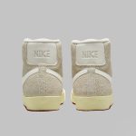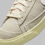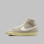 Spre deosebire de omologul său Blazer Mid „Ice Blue”, silueta din imagine se bucură de o estetică neutră, acoperind partea superioară din piele întoarsă și panourile din partea din față într-o nuanță „Light Bone”. Completând ansamblul cu culori pământii, șireturile crem funcționează în tandem cu o limbă și o căptușeală albe impecabile, în timp ce Swoosh-urile asortate și marginile din spate în relief conferă un finisaj neted din piele. Așezate peste o talpă cu nuanțe de alabastru învechit, branțurile modelului oferă singura mostră a spectrului tonal, cu branțuri roșii în titlu.