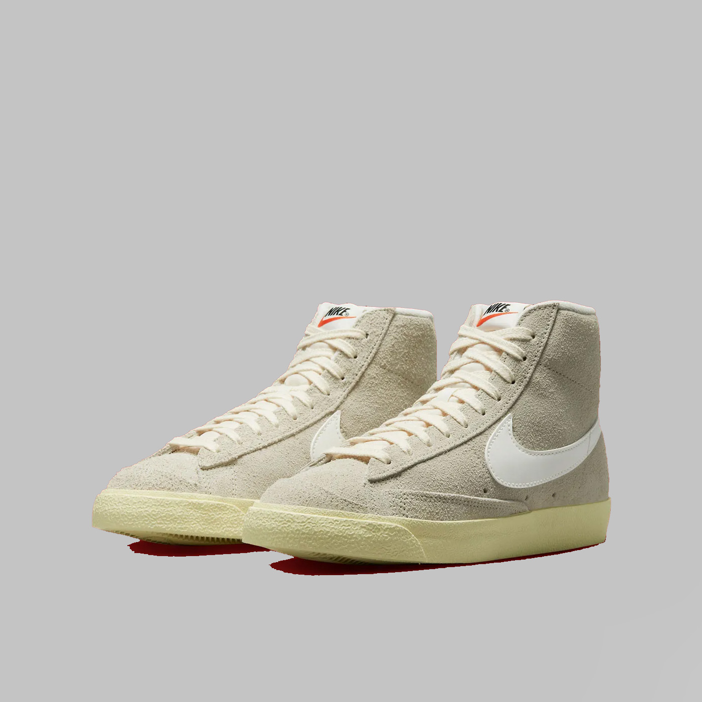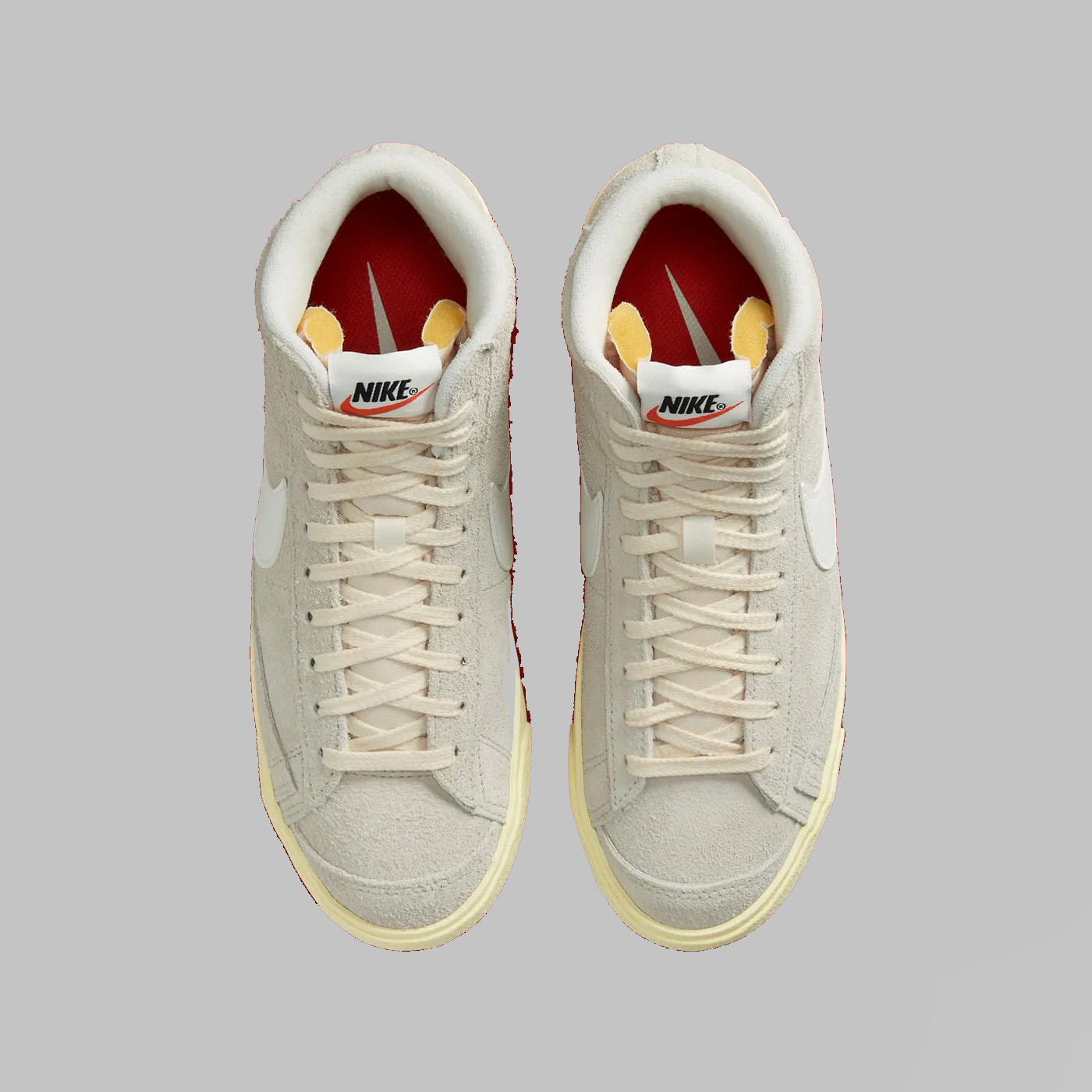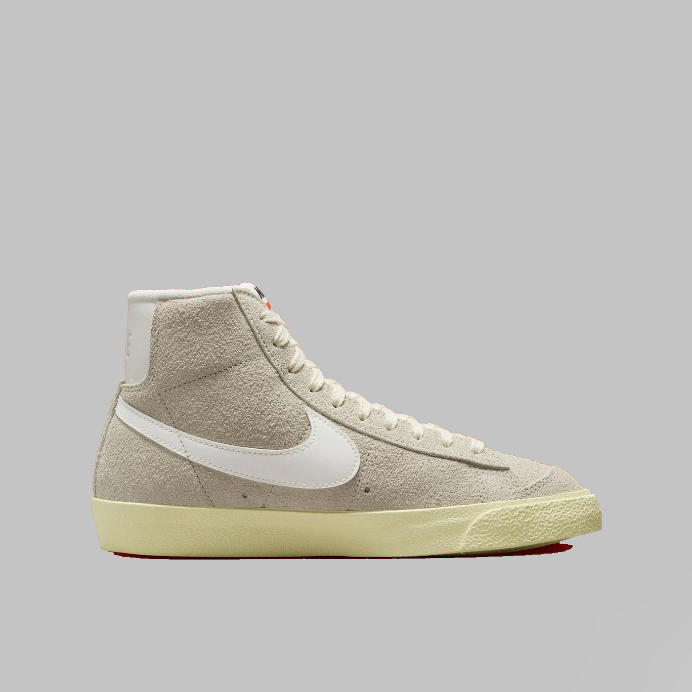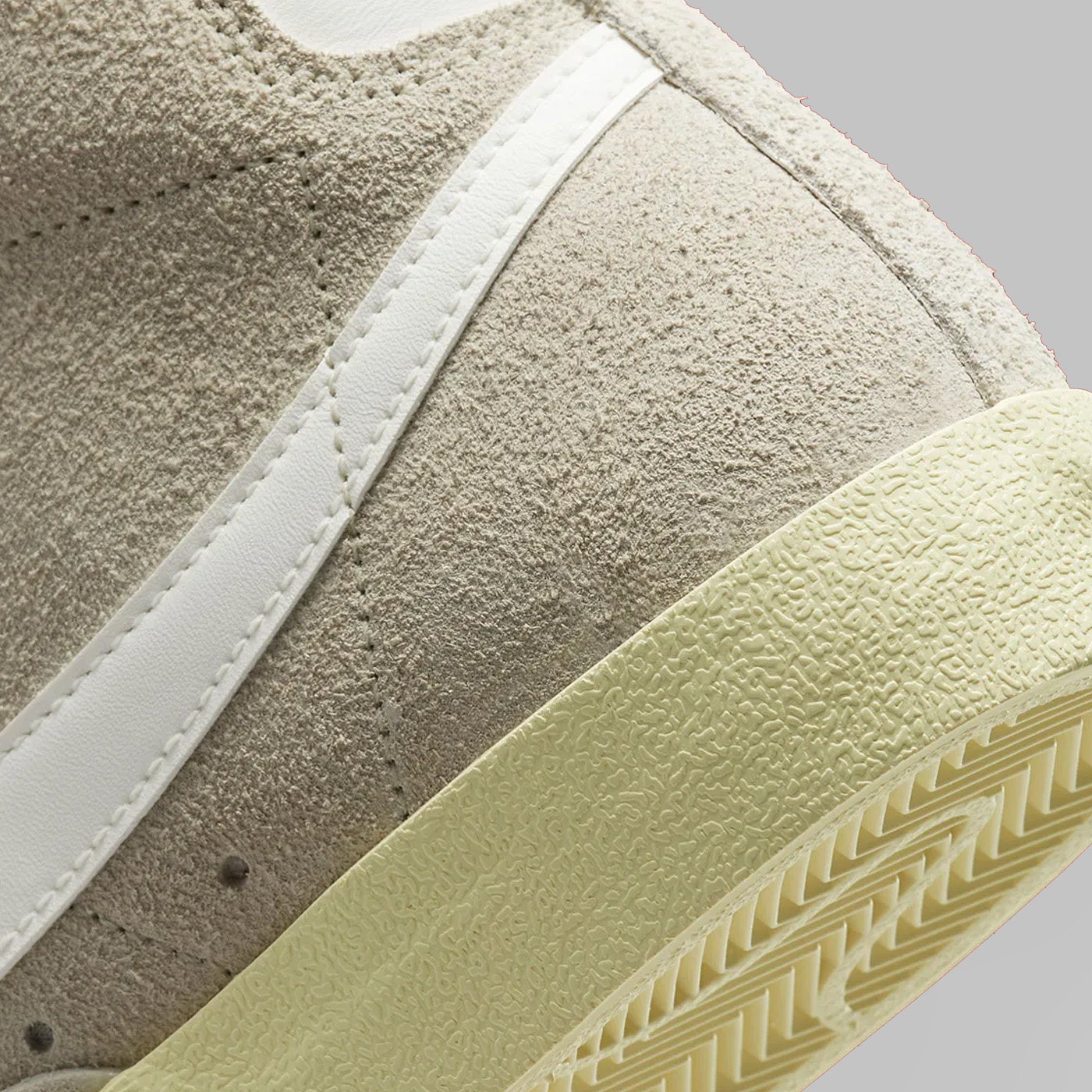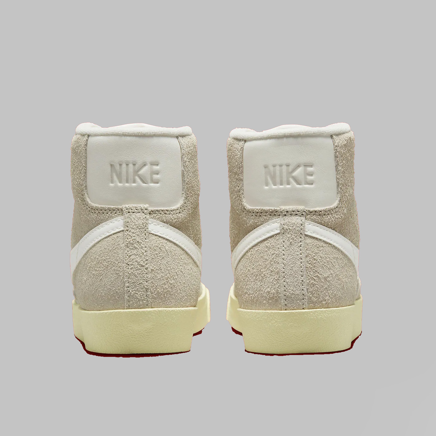 Spre deosebire de omologul său Blazer Mid „Ice Blue”, silueta din imagine se bucură de o estetică neutră, acoperind partea superioară din piele întoarsă și panourile din partea din față într-o nuanță „Light Bone”. Completând ansamblul cu culori pământii, șireturile crem funcționează în tandem cu o limbă și o căptușeală albe impecabile, în timp ce Swoosh-urile asortate și marginile din spate în relief conferă un finisaj neted din piele. Așezate peste o talpă cu nuanțe de alabastru învechit, branțurile modelului oferă singura mostră a spectrului tonal, cu branțuri roșii în titlu.