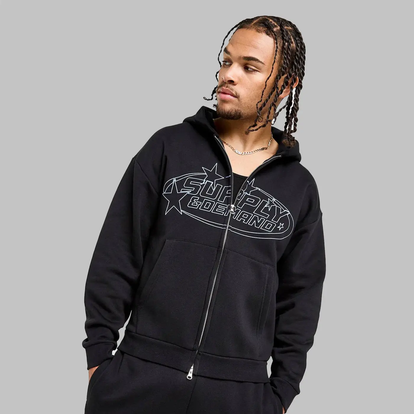 Stilul street, exclusiv JD. Acest trening bărbătesc Fragment de la Supply & Demand este conceput pentru orice motiv. Moale și lânos, are închidere cu fermoar și glugă pentru acoperire personalizată. Talie elastică cu șnur la pantalonii de trening asortați pentru ajustarea croială. Și buzunare laterale pentru depozitare. Sigla Supply & Demand este imprimată. Se poate spăla la mașină.