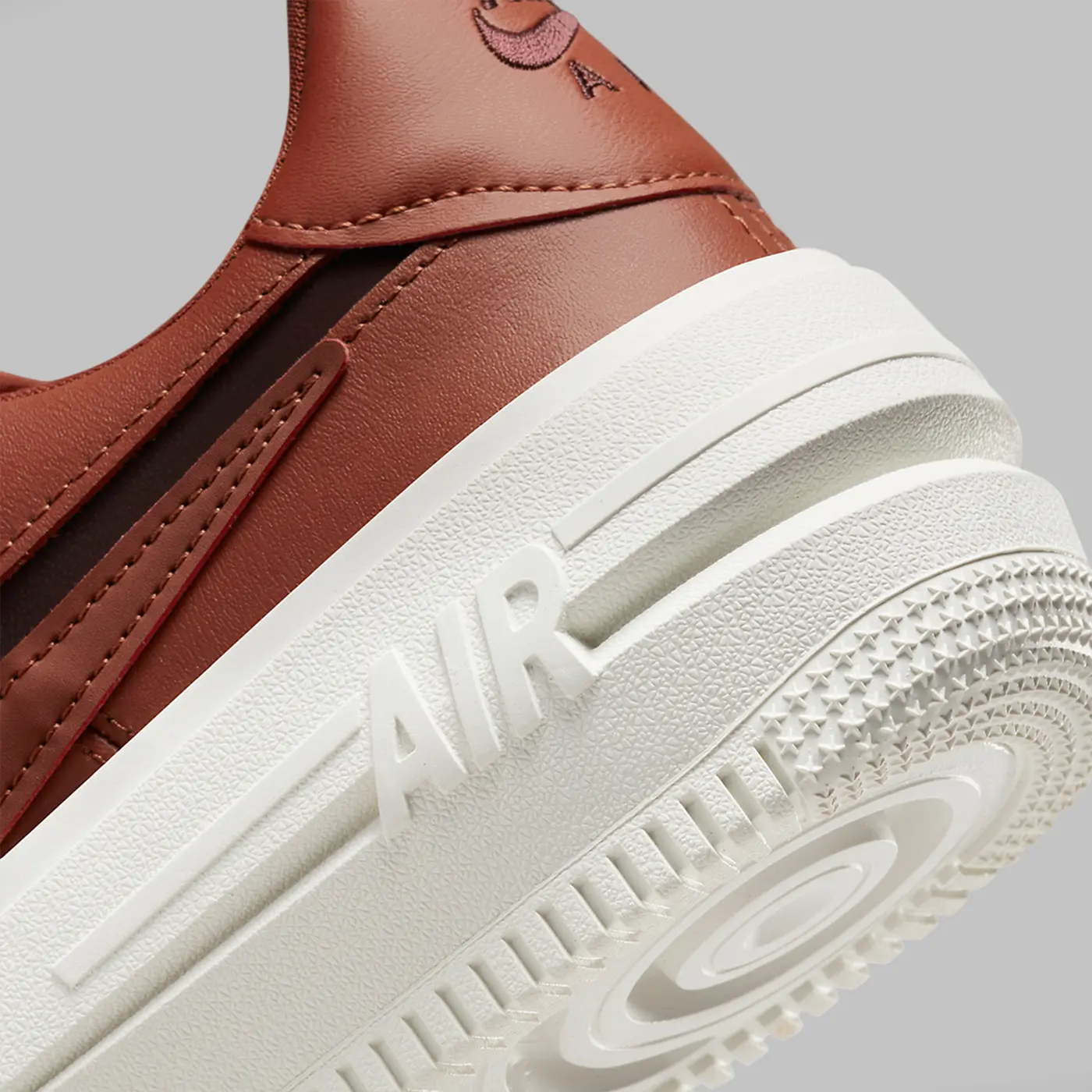 Fețea superioară „Mars Stone”, bogat nuanțată, este tratată pe întreaga suprafață a panourilor din piele netedă, fiind în contrast cu o talpă intermediară îmbrăcată în „Sail”, pentru o selecție fină de blocare a culorilor în două tonuri. Siluetele Swooshes, șireturile și construcția limbii din plasă sunt toate asortate cu nuanța portocalie ruginie, în timp ce un „Burgundy Crush” cu aromă de ciocolată umple decupajul secundar Swoosh, iar atât limba, cât și călcâiul sunt brodate cu brandingul „NIKE AIR”.