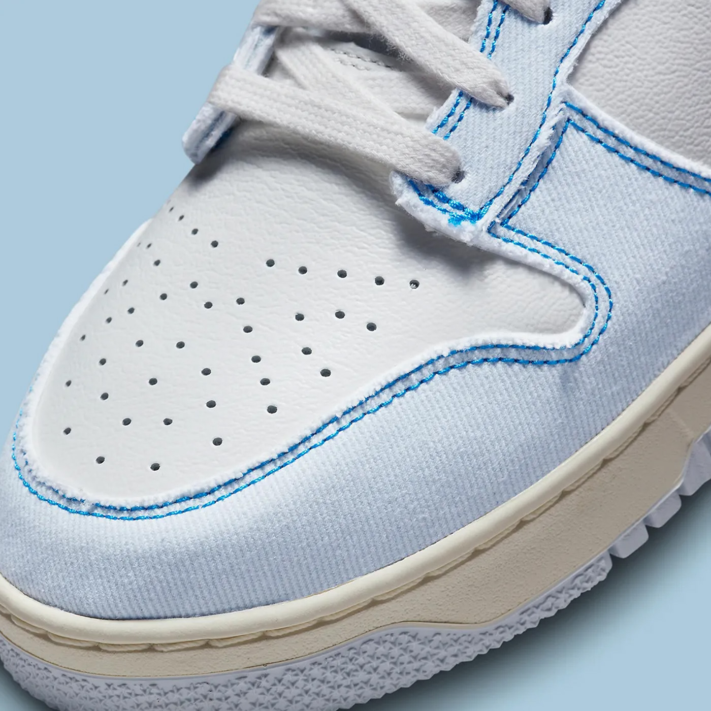 Deși poate prezenta o formă care amintește de originalul din 1985, materialele și culorile acestei perechi sunt departe de a fi inspirate de BTTYS. Suprapunerile, pentru început, au o placă groasă de denim, ușor pliată, care este decolorată uniform până la o spălare ușoară. Și, spre deosebire de o pereche de blugi, cusăturile optează pentru firul albastru închis de-a lungul marginii fiecăruia dintre panourile menționate mai sus. Completand construcția sunt o serie de piei turnate, al căror finisaj alb completează șireturile și limba adiacente, precum și căptușeala și talpa exterioară; talpa intermediară, totuși, optează pentru a imite vârsta prin îngălbenirea deschisă.