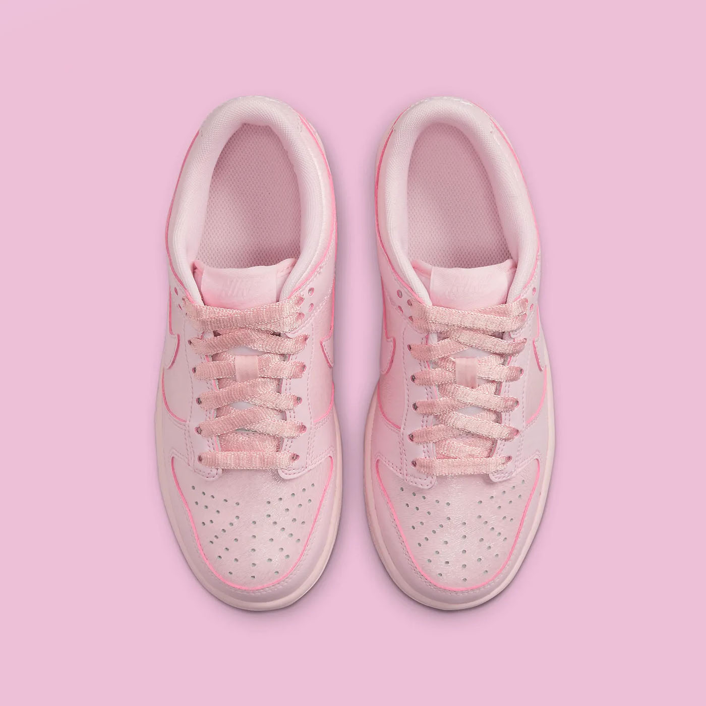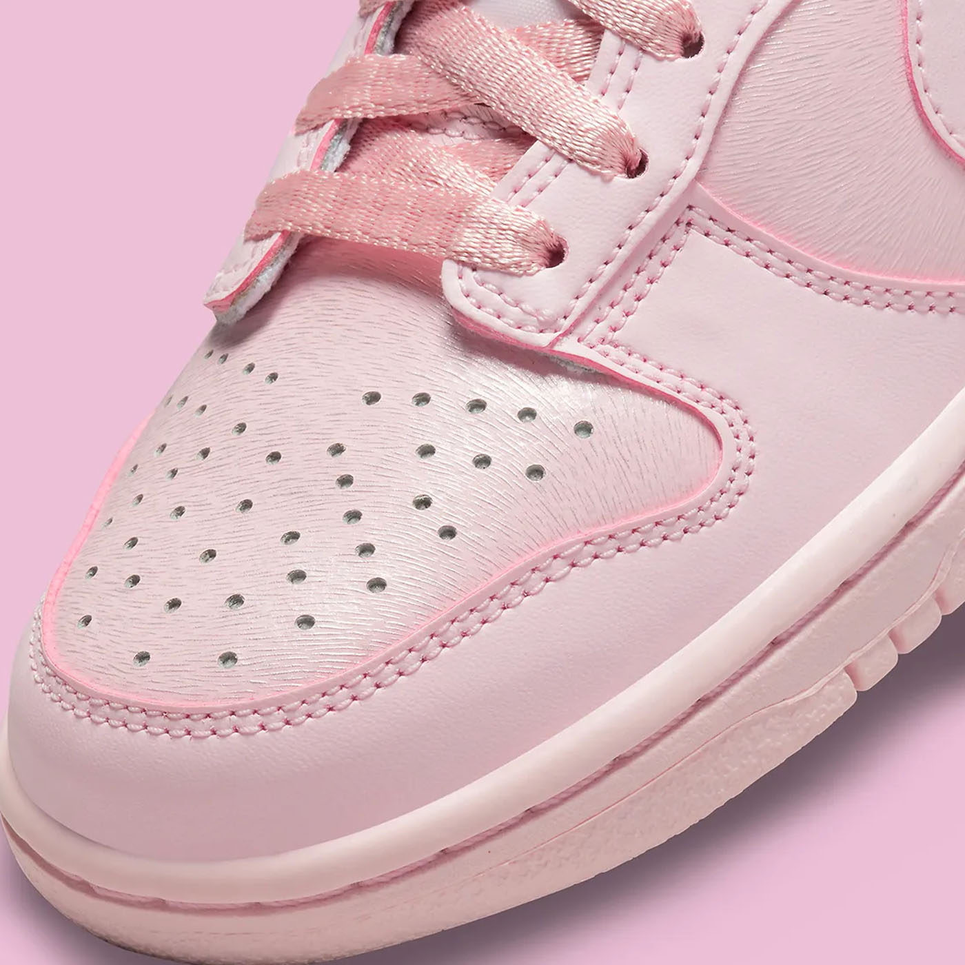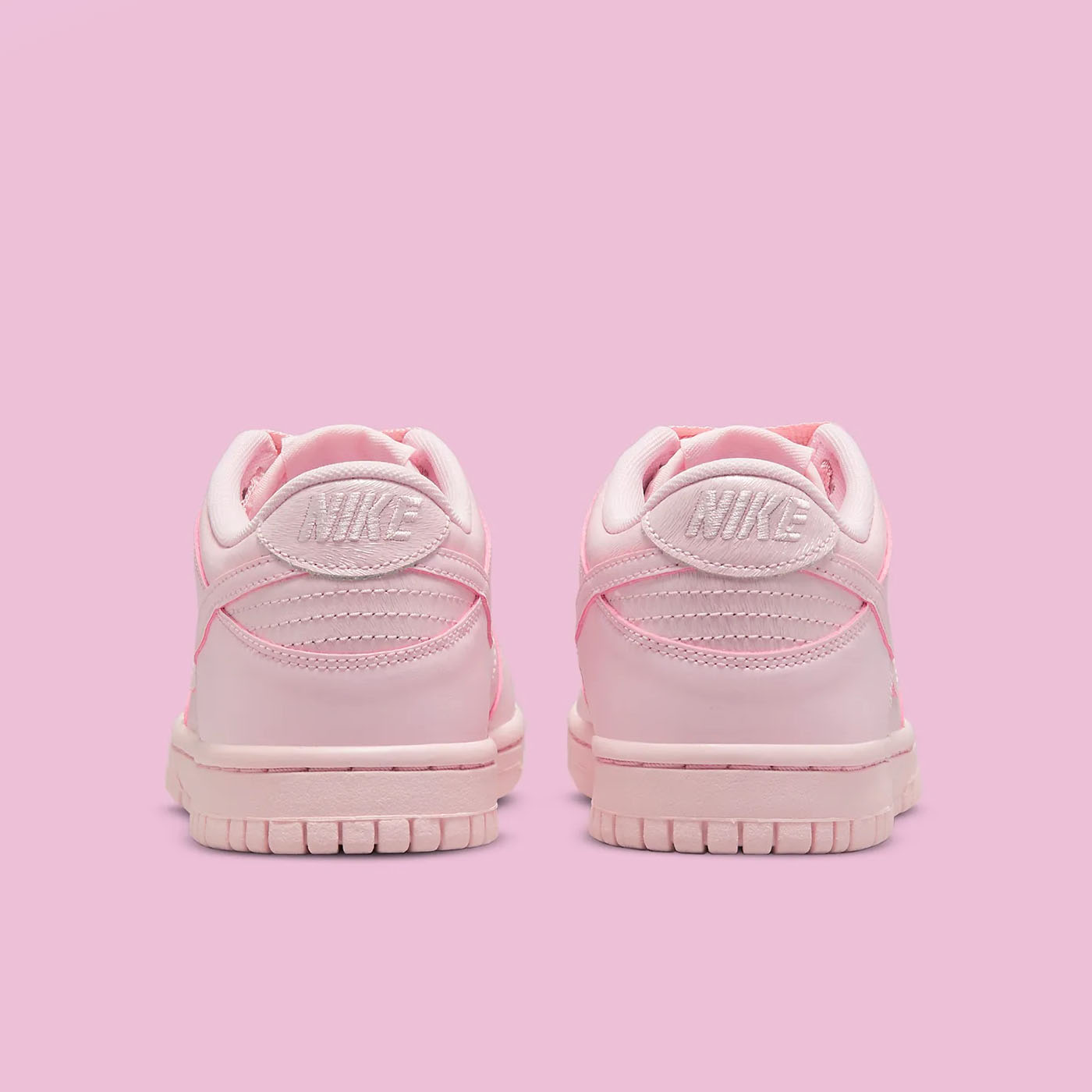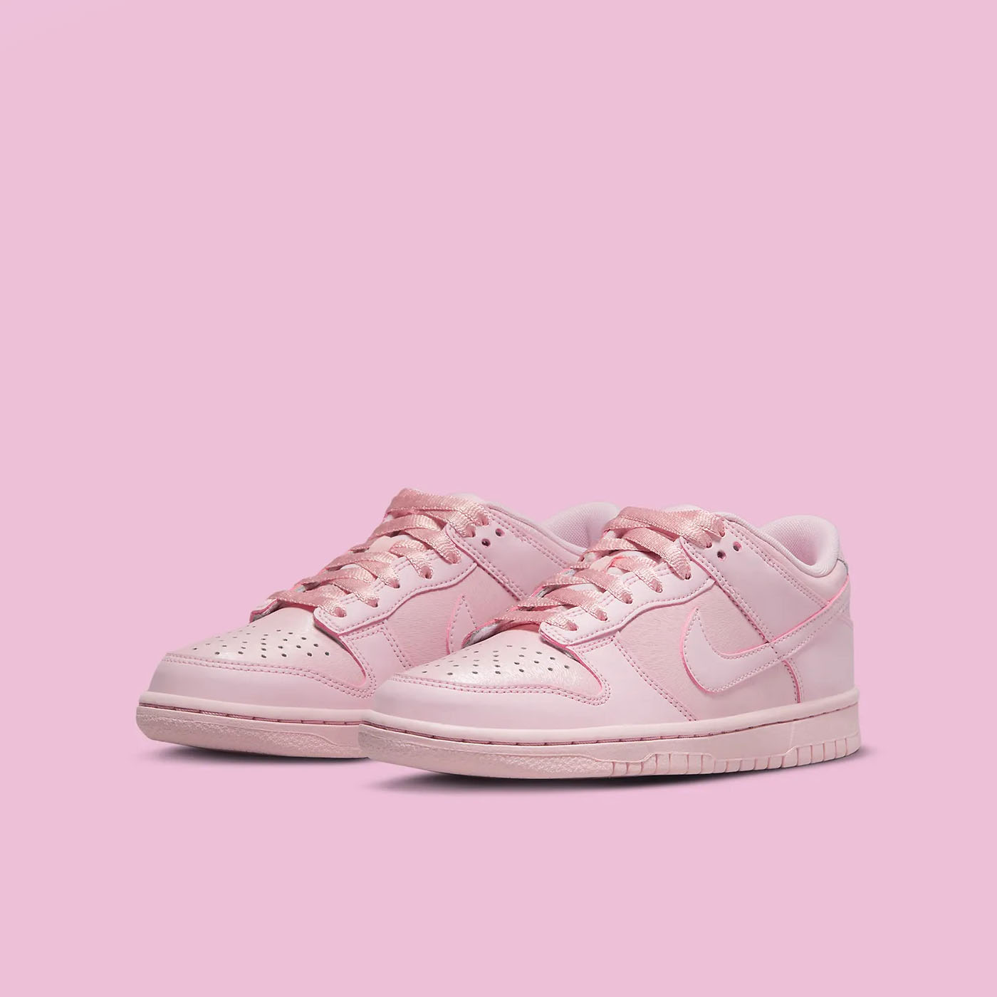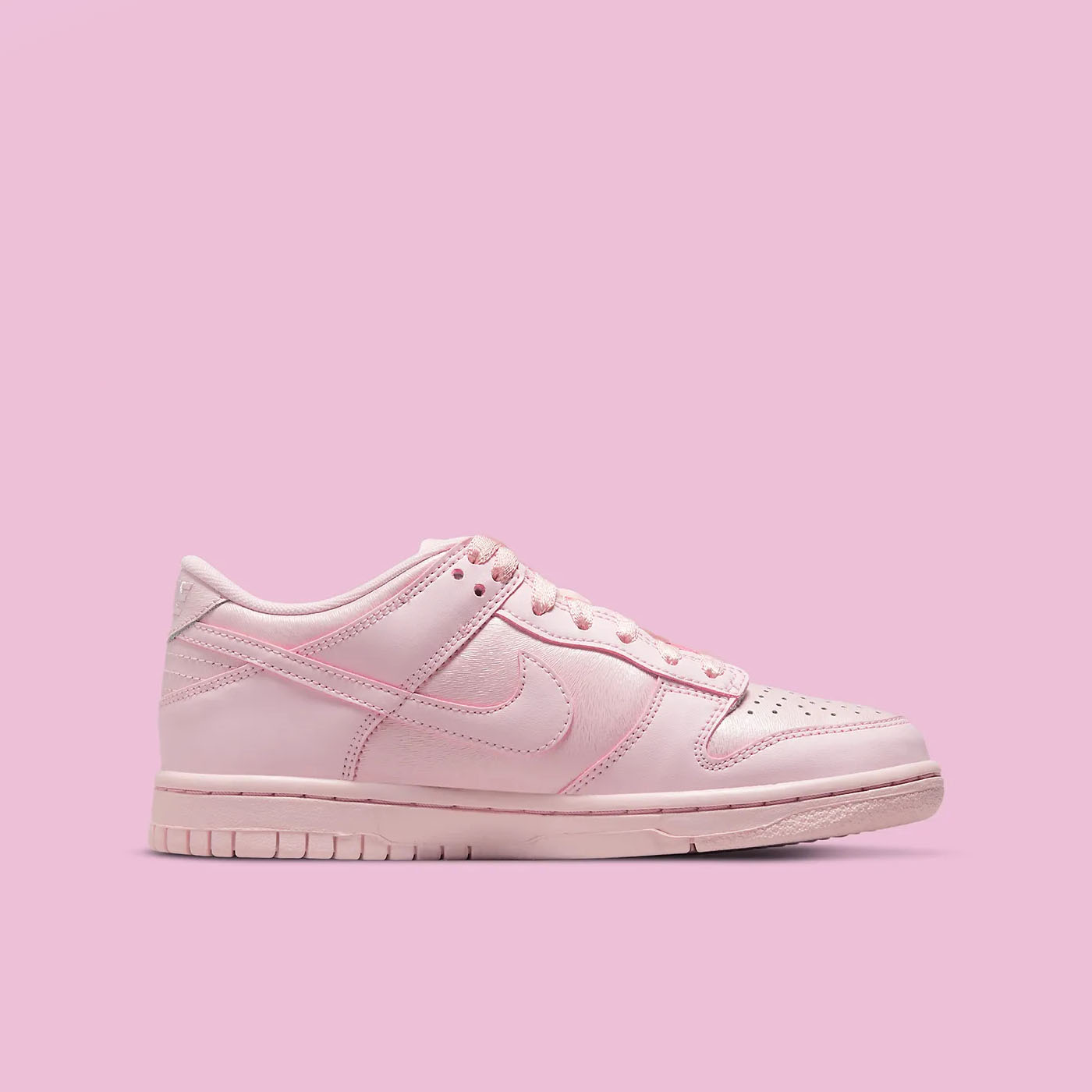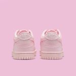 Nike Dunk Low GS „Pink Prism” este un sneaker destinat tinerilor, remarcându-se printr-un design monocromatic într-o nuanță pastelată de roz. Partea superioară este confecționată din piele moale, având o textură fină pe vârf, guler și panourile laterale. Modelul păstrează elementele clasice, precum vârful perforat și limba respirabilă din nailon. O caracteristică distinctivă este utilizarea șireturilor tip panglică, oferind un aspect elegant și modern. Talpa din cauciuc de aceeași nuanță completează aspectul armonios și asigură durabilitate.