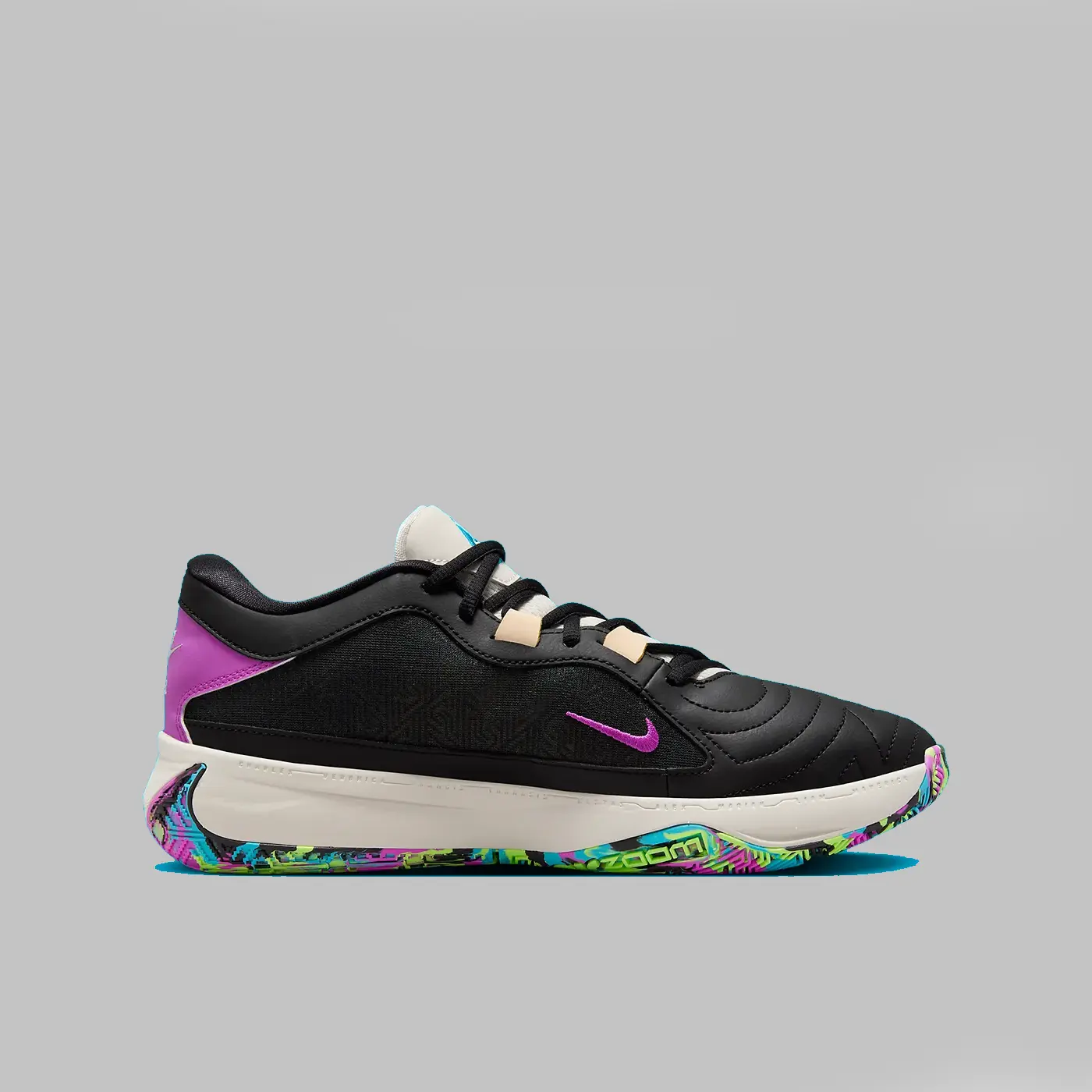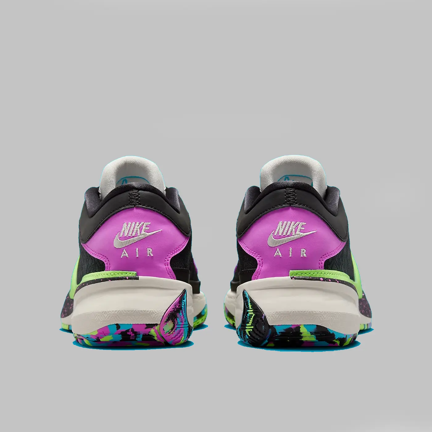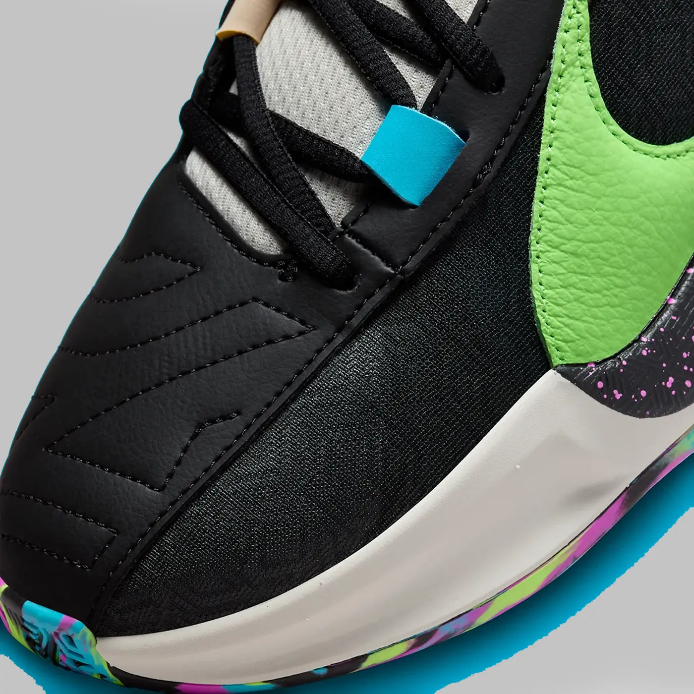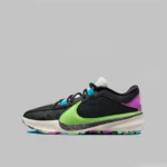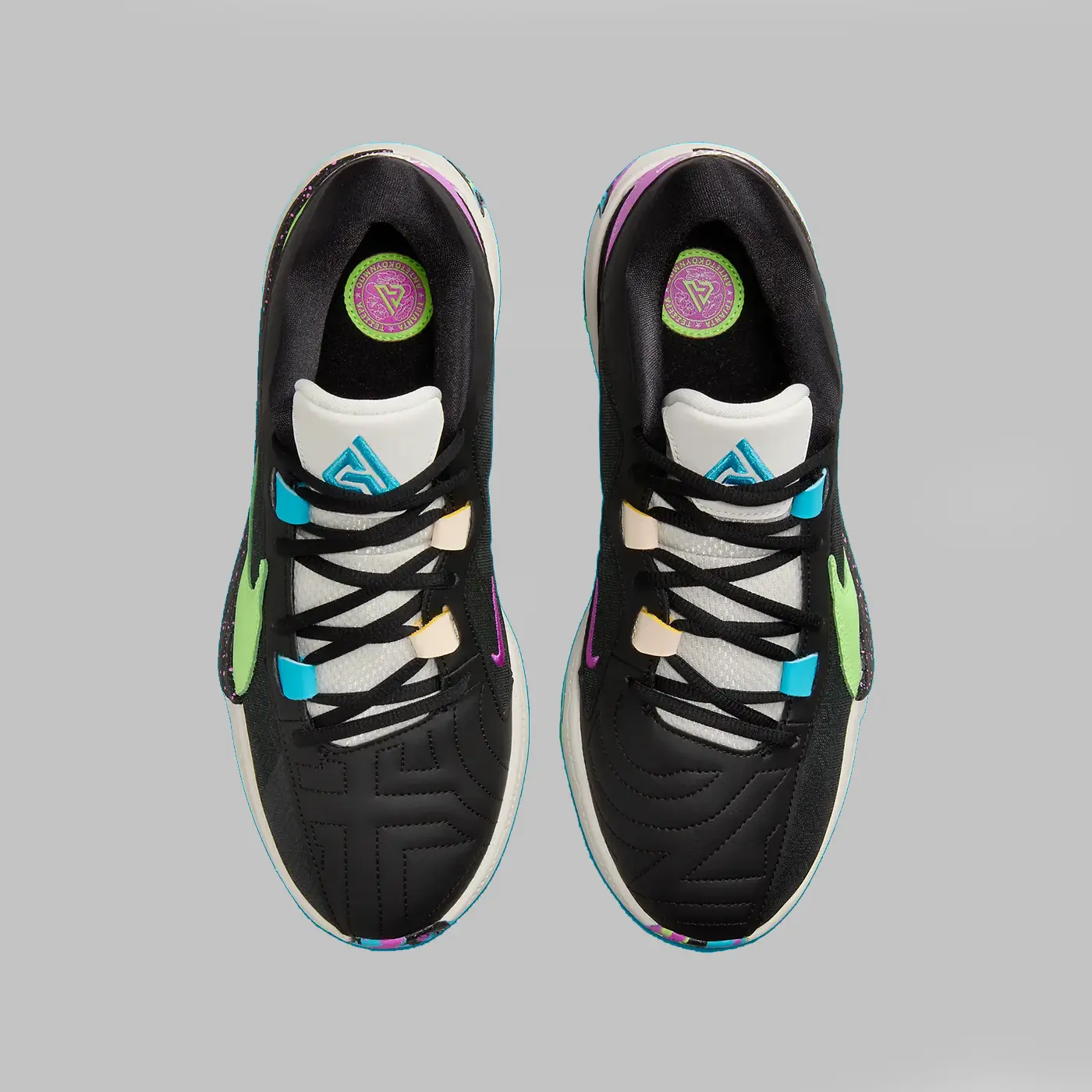 Îmbrăcat într-o schemă de culori Negru, Phantom, Fuchsia Dream, Baltic Blue și Lime Blast. Această ofertă a Nike Zoom Freak 5 are o parte superioară din plasă neagră acoperită cu un model geometric tonal cu suprapuneri din piele de-a lungul vârfului, a ochilor și a gulerului. Punerea în evidență a pantofului este Swoosh-ul său supradimensionat Lime Green pe partea laterală, cu un mini Swoosh brodat Fuchsia pe partea medială și urechile asortate pe călcâi. Logo-ul semnăturii lui Antetokounmpo în albastru este brodat pe limbi cu marca Nike pe călcâie, deasupra unei talpi intermediare din spumă albă și talpa exterioară din cauciuc multicoloră completează designul. Pantoful va fi disponibil pentru mărimea bărbătească.