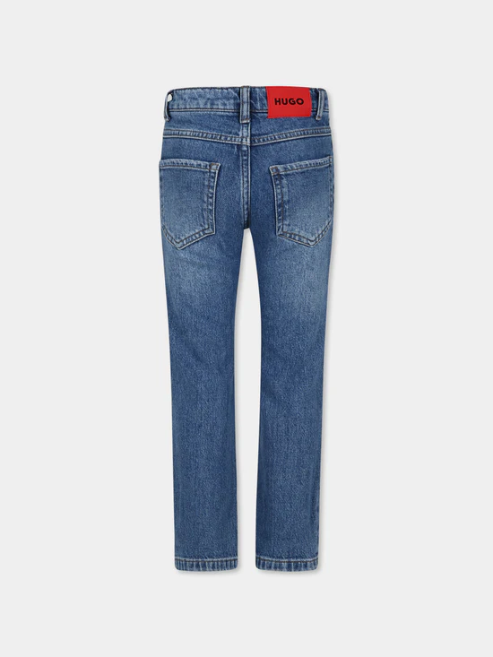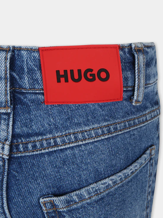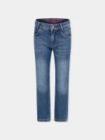 Blugi din denim albastru, cinci buzunare, cu bucle pentru curea, inchidere cu fermoar si nasture frontale, talie reglabila datorita benzilor elastice interne cu nasture. Sunt impodobite cu un plasture cu logo pe fata si pe spate.