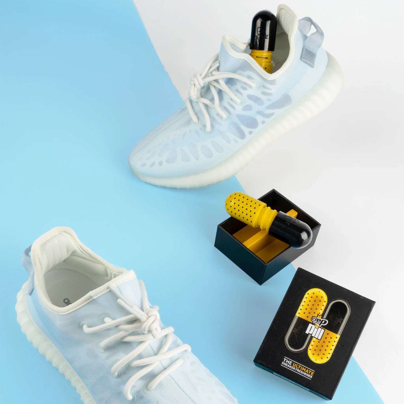 Păstrează-ți pantofii proaspăți în interior și în exterior cu pastilele pentru adidași. Răsuciți pilula pentru nivelul preferat de prospețime (scăzut, mediu, ridicat) și pur și simplu introduceți-l în pantofi sport după ce i-ați scos.