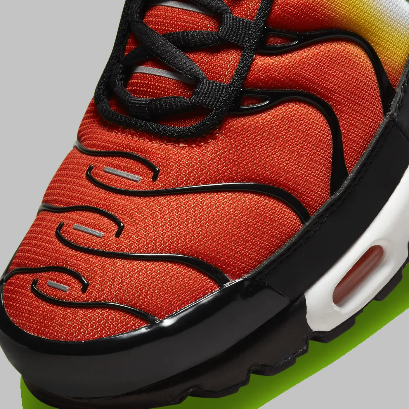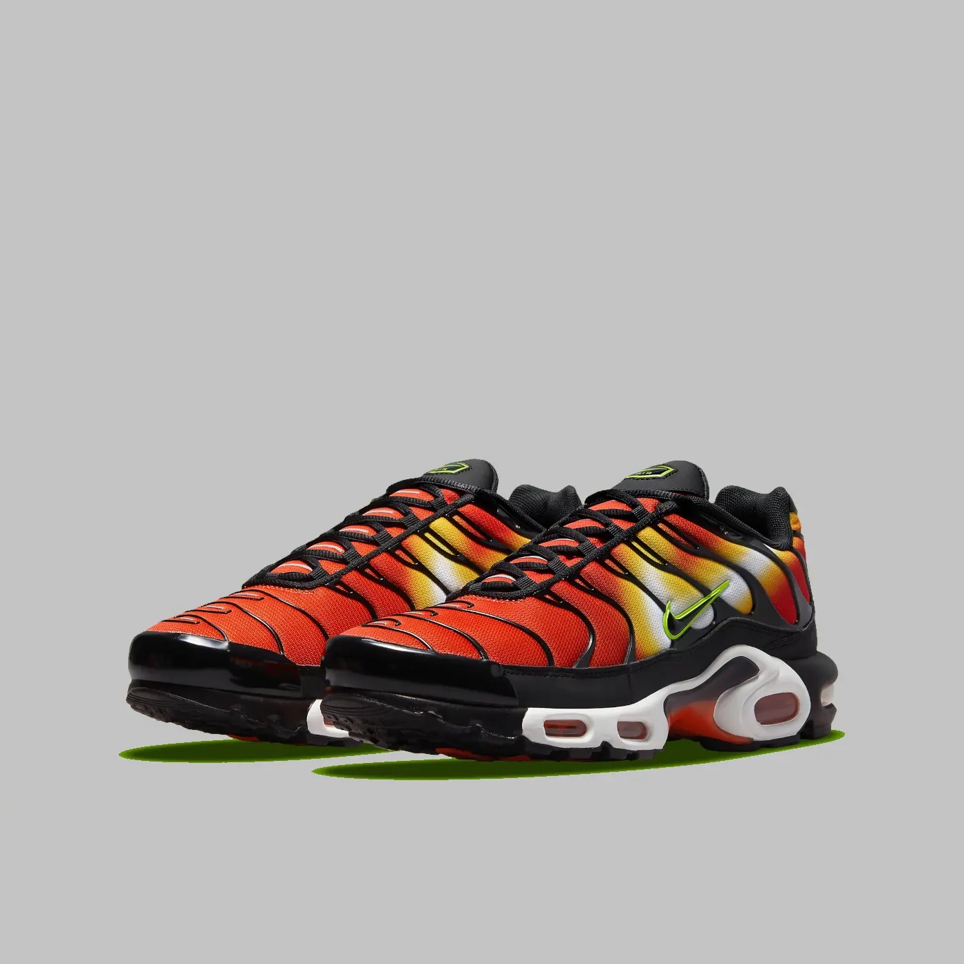 Этот силуэт, разработанный Шоном Макдауэллом как эксклюзив для Foot Locker в 1998 году, представил новую градиентную отделку и настроенную воздушную амортизацию в линейке беговых кроссовок Nike. В своем последнем предложении любимцы Великобритании возвращаются к своему первому релизу «Magma», надев сетчатый верх с градиентом, напоминающим закат. Акценты оранжевого, желтого и белого цветов воссоздают естественное явление, а окружающие черные накладки из ТПУ и компоненты подошвы уравновешивают привлекательную композицию. Тем не менее, профильные галочки и значки на верхней части язычка еще больше оживляют вариант Air Max своим неоново-зеленым оттенком. Вместе каждый вышеупомянутый компонент создает стиль, который обязательно привлечет внимание.