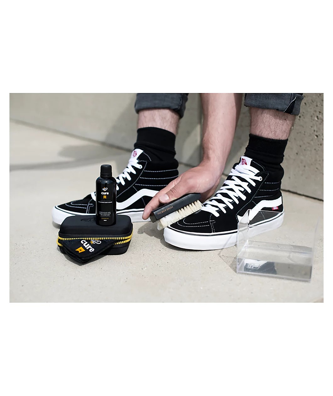 ULTIMATE SNEAKER CLEANER — Каждая пара кроссовок заслуживает того, чтобы выглядеть как можно лучше. С помощью нашего набора для чистки и раствора CURE сохраните первозданный вид вашей любимой обуви — очистите до 50 кроссовок с помощью набора CURE.