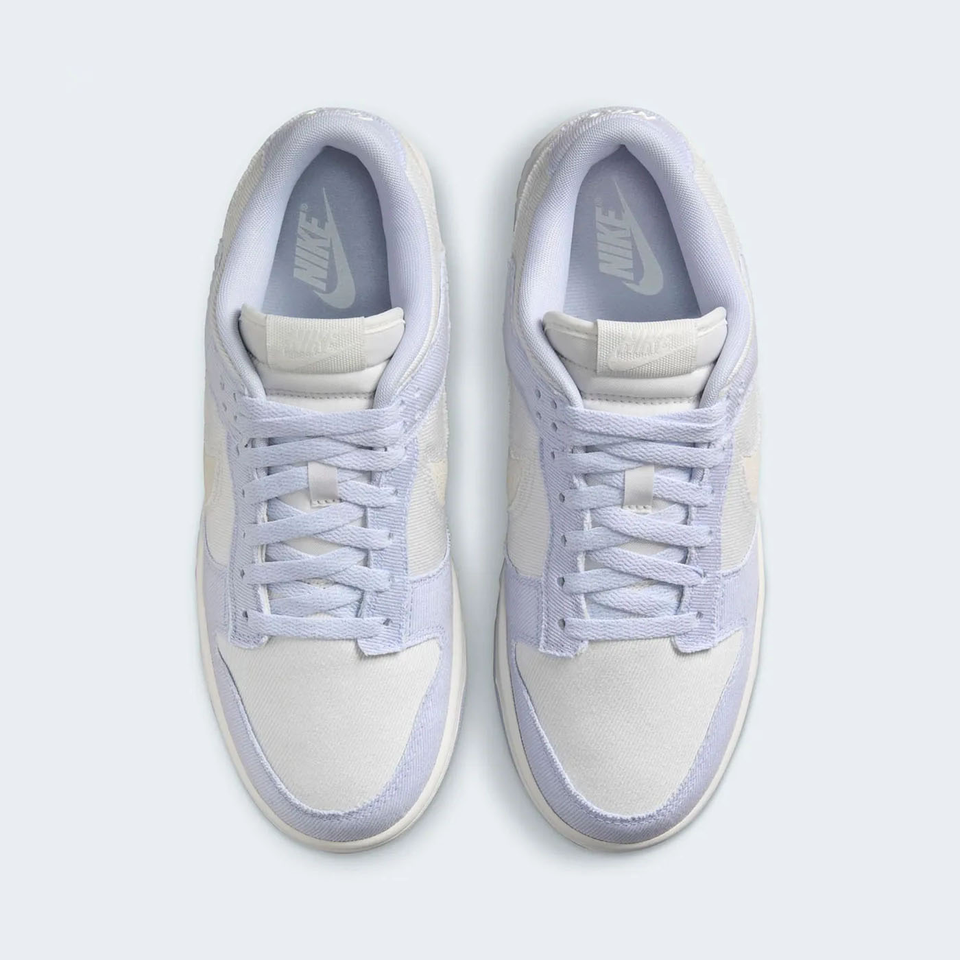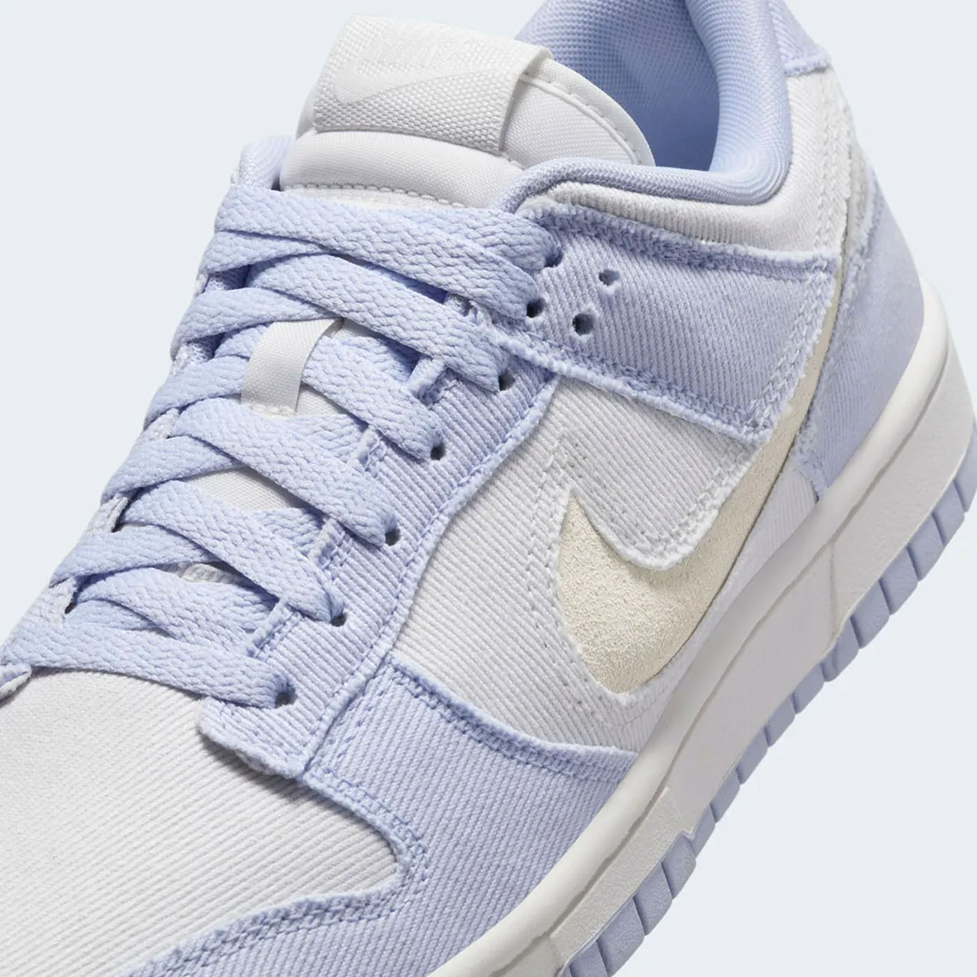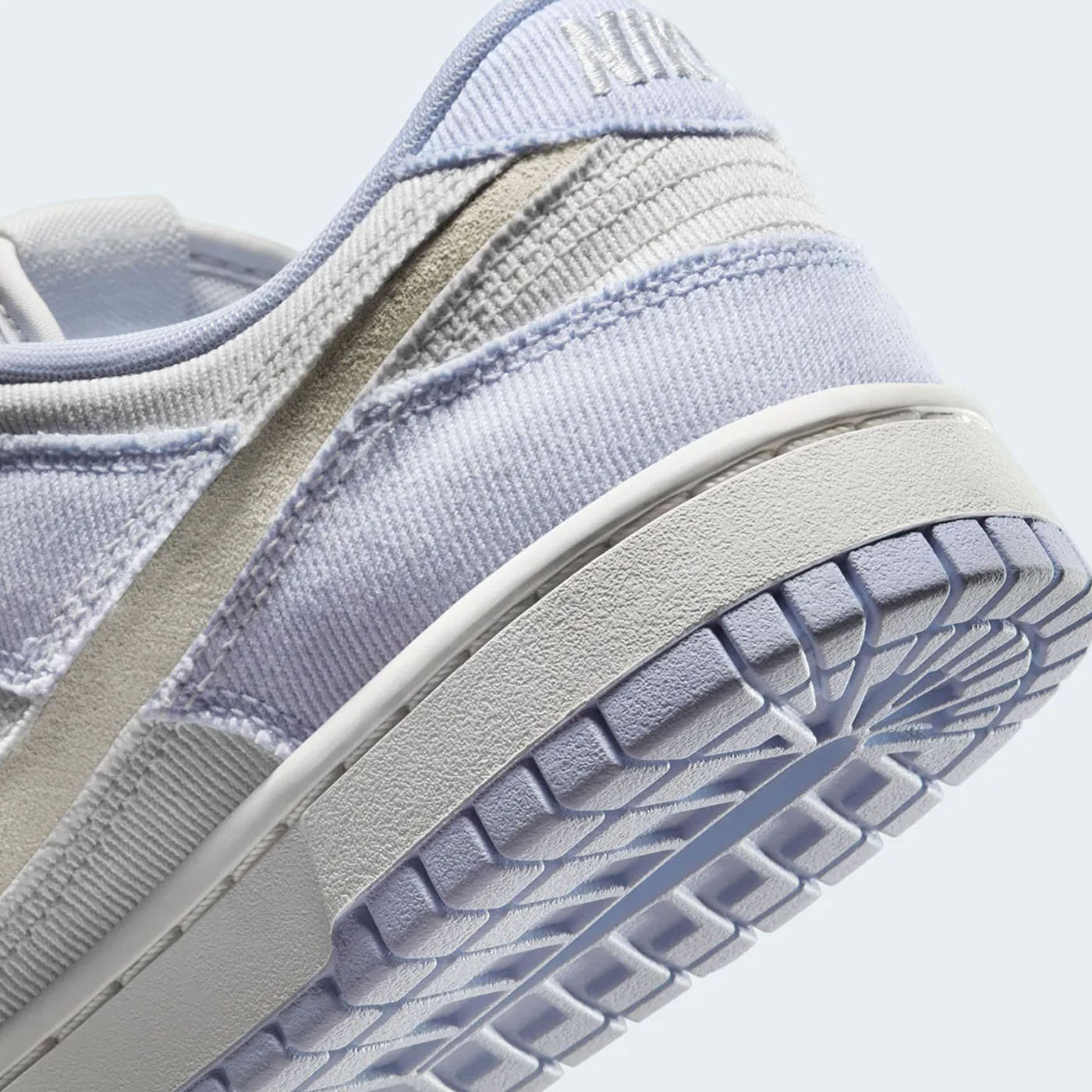 Материалы: Верхняя часть кроссовок выполнена из твилового денима светло-индигового оттенка, называемого «Ghost». Основные панели, такие как носок, боковые части и воротник, отделаны в цвете «Platinum Tint», создавая тонкий контраст. Боковой логотип Swoosh вырезан, открывая нижний слой из замши цвета «Summit White», что придаёт дизайну уникальность .